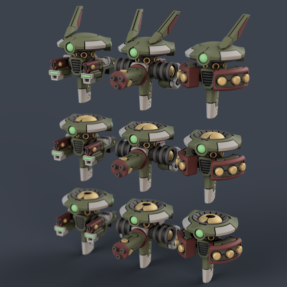 This is my first go at modeling any sort of vehicle, and I think I managed to get what was in my head into a multipart model. This kit like the ones before it, has a good deal of variety with how it can be assembled. Hull mounted, turret mounted, and even undermounted. The little guppies can be mounted to side engines as needed, or sisterly with their own options.